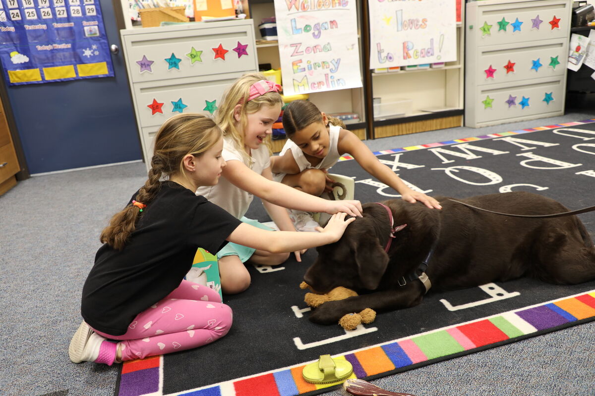 One of the stars of the day was Merlin, a chocolate Lab who arrived with his favorite stuffed toy in tow. Students took turns reading with Merlin, while others helped groom him gently and calmly, making him feel right at home. Merlin listened closely as students read stories—sometimes with excitement, sometimes with quiet focus—and was a patient and steady companion throughout.
